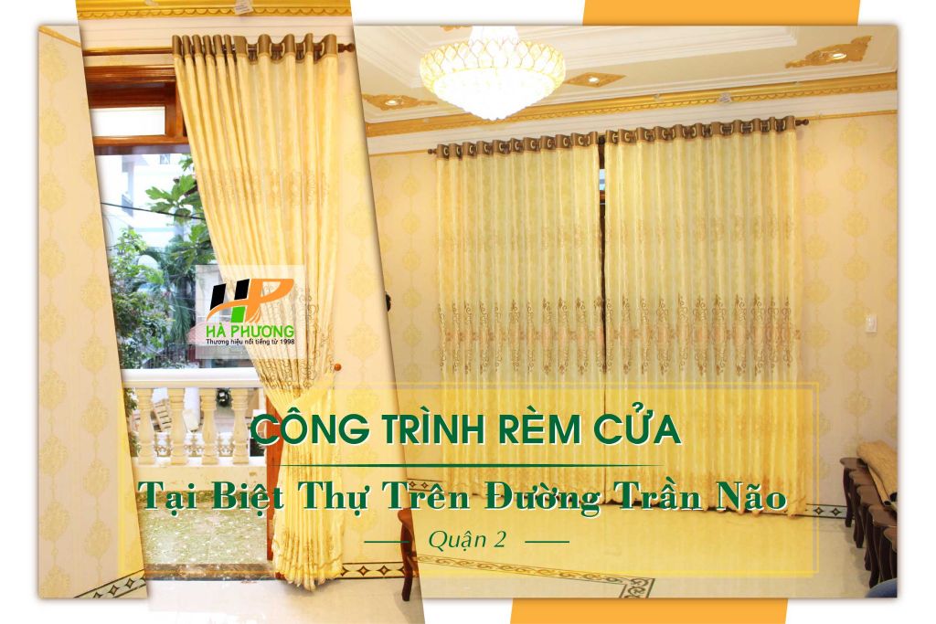 Công trình rèm cửa quận 2 được thực hiện tại Biệt thự đường số 20, phường Bình An, Quận 2 với chất liệu vải gấm thêu. Ngôi biệt thự với lớp giấy dán tường màu vàng cùng với những họa tiết hoa văn làm cho không gian trở nên đẹp hơn, vì thế rèm cửa Hà Phương đã tư vấn cho gia chủ chất liệu vải gấm thêu có họa tiết và màu sắc gần giống với giấy dán tường. Bộ rèm cửa sau khi được treo lên rất nổi bật bởi các họa tiết trên bề mặt vải đều được thêu mang đến một không gian sang trọng. Chất liệu vải gấm nhung có bề mặt mềm mịn, họa tiết thêu tinh tế thường được sử dụng tại các biệt thự, khách sạn, nhà hàng,… bởi nó mang đến vẻ đẹp sang trọng và cổ điển.